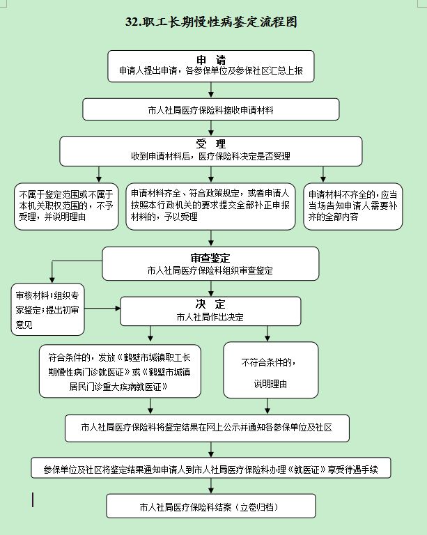 依法作出决定;网上公示结果。符合条件的,发放《鹤壁市城镇职工长期慢性病门诊就医证》或《鹤壁市城镇居民门诊重大疾病就医证》;不符合条件的,说明理由;法定告知。 |