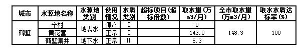 2016年10月,全市共取用2个在用集中式生活饮用水水源,其中地表水水源黄花营、地下水水源鹤壁集井。