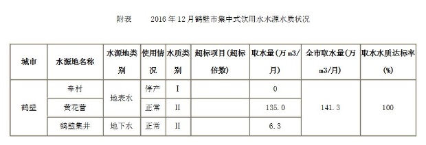 2016年12月,全市实际取用集中式地下水饮用水源辛村达标(达到或优于Ⅲ类标准)(详见附表)。