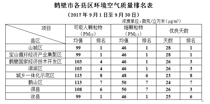 依据我市的国控、省控、市控环境空气自动监测站监测数据,根据相关文件要求,现将我市各县区2017年9月环境空气质量排名情况公布如下: