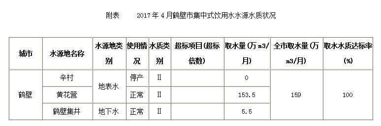 2017年4月,全市实际取用集中式地下水饮用水源鹤壁集井达标(达到或优于Ⅲ类标准)(详见附表)。