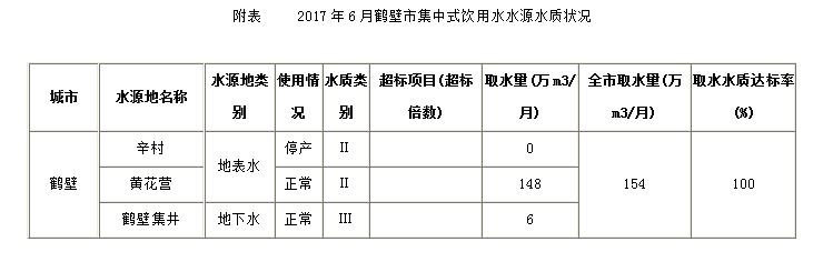 2017年6月,全市实际取用集中式地下水饮用水源鹤壁集井达标(达到或优于Ⅲ类标准)(详见附表)。